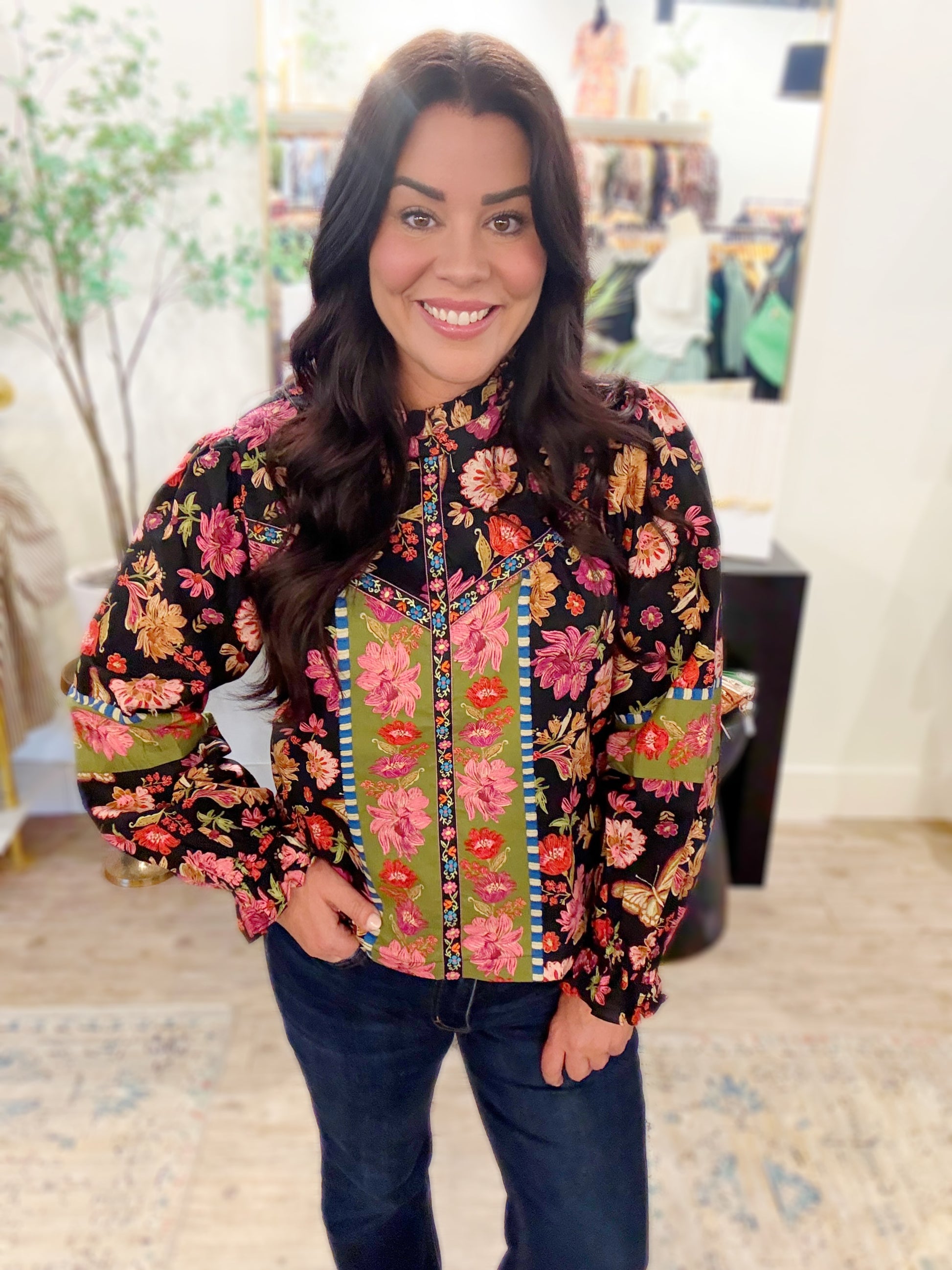This is a statement floral blouse with a vibrant and artistic design. It features: